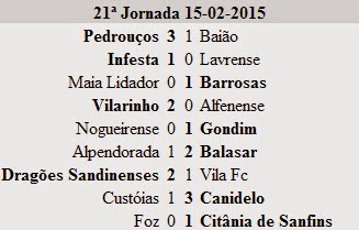 O Canidelo foi surpreendido na deslocação ao terreno do Citânia de Sanfins onde perdeu por 2-1, sendo ultrapassado por Gondim e Vilarinho. O Dragões Sandinenses continua sem vencer em casa. A equipa recebeu o Gondim e acabou derrotada por uma bola a zero, caindo também para 11º posto com 24 pontos. O Vila Fc não foi além de um empate na visita ao Foz, a dois golos, mantendo ainda assim, o nono lugar agora com 25 pontos.